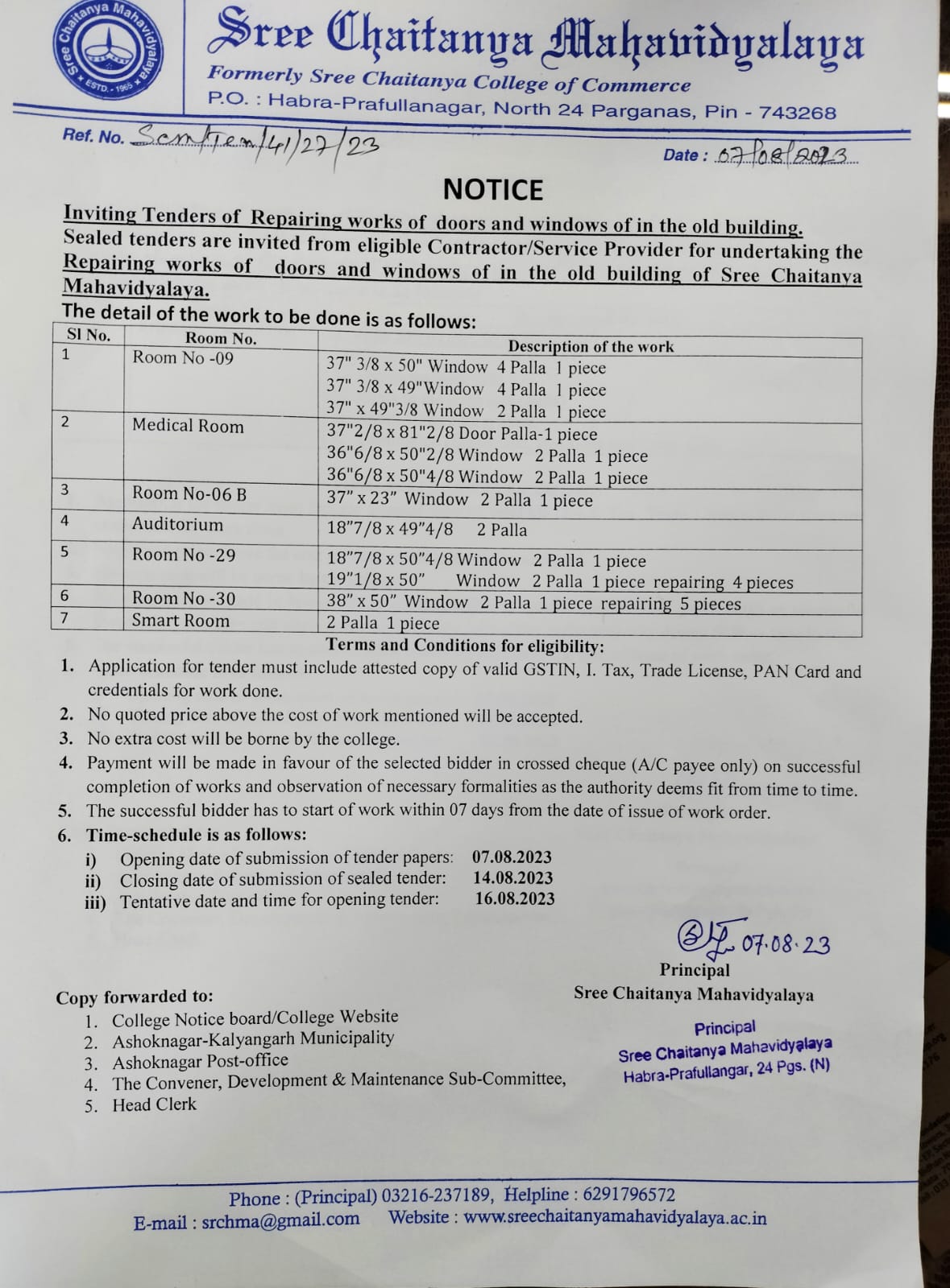 Inviting Tenders for repairing works of grills, windows etc. for college auditorium |